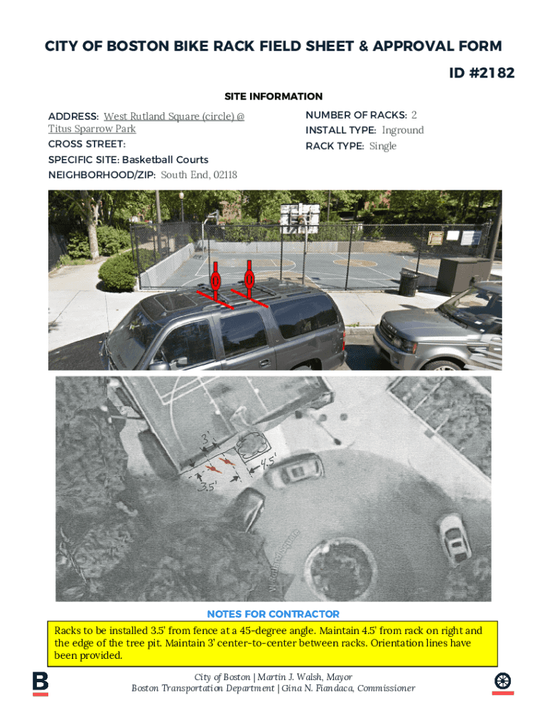 CITY OF BOSTON BIKE RACK FIELD SHEET & APPROVAL FORM ID #2182 SITE INFORMATION ADDRESS: West Jutland Square (circle) @ Titus Sparrow Park CROSS STREET:NUMBER OF RACKS: 2 INSTALL TYPE: In ground RACK