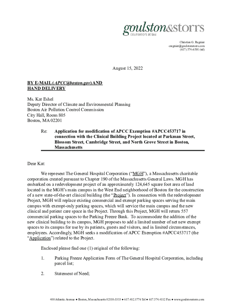 Christian G. Regular cregnier@goulstonstorrs.com (617) 5746591 (tel)August 15, 2022, BY EMAIL (APCC@boston.gov) AND HAND DELIVERY Ms. Kat Ethel Deputy Director of Climate and Environmental Planning