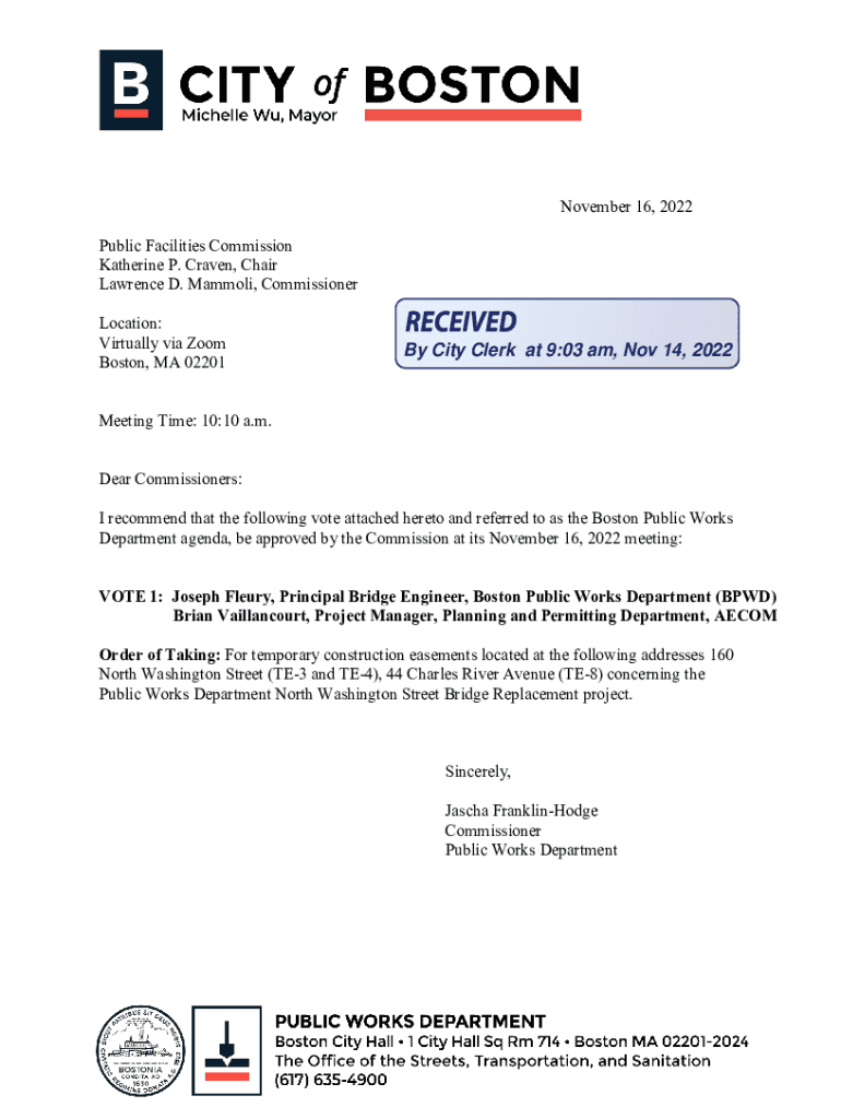 November 16, 2022, Public Facilities Commission Katherine P. Craven, Chair Lawrence D. Mammals, Commissioner Location: Virtually via Zoom Boston, MA 02201By City Clerk at 9:03 am, Nov 14, 2022Meeting