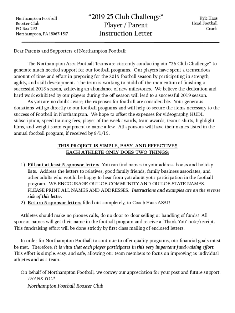 Northampton Football Booster Club PO Box 292 Northampton, PA 1806715172019 25 Club Challenge Player / Parent Instruction Letter Kyle Haas Head Football Cochlear Parents and Supporters of Northampton