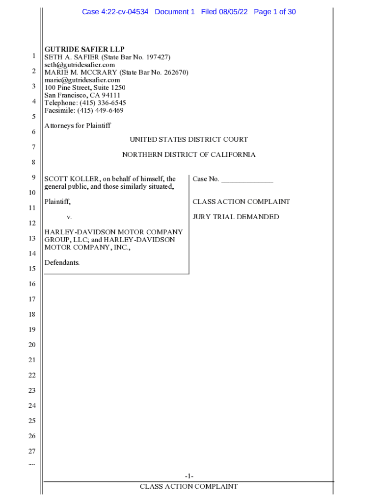 Case 4:22cv04534 Document 1 Filed 08/05/22-Page 1 of 301 2 3 4 5 6GUTRIDE SAFER LLP SETH A. SAFER (State Bar No. 197427) seth@gutridesafier.com MARIE M. McCray (State Bar No. 262670) marie@gutridesafier.com