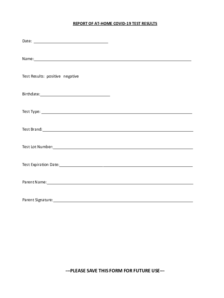 REPORT OF HOME COVID-19 TEST RESULTSDate: ___Name:___Test Results: positive negativeBirthdate:___Test Type: ___Test Brand:___Test Lot Number:___Test Expiration Date:___Parent Name:___Parent Signature:___PLEASE