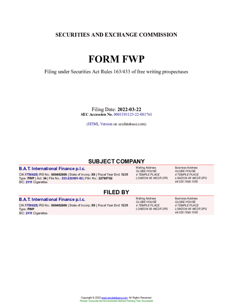 Get the free B.A.T. International Finance p.l.c. Form FWP Filed 2022-03-22