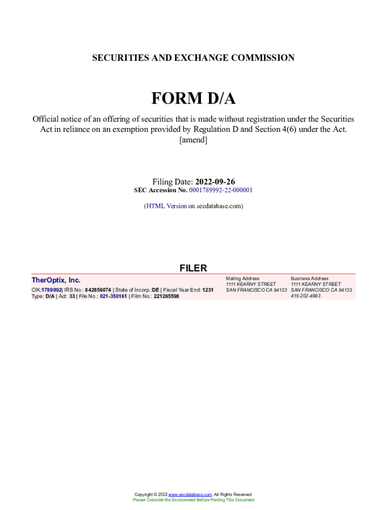 Get the free TherOptix, Inc. Form D/A Filed 2022-09-26. Accession Number
