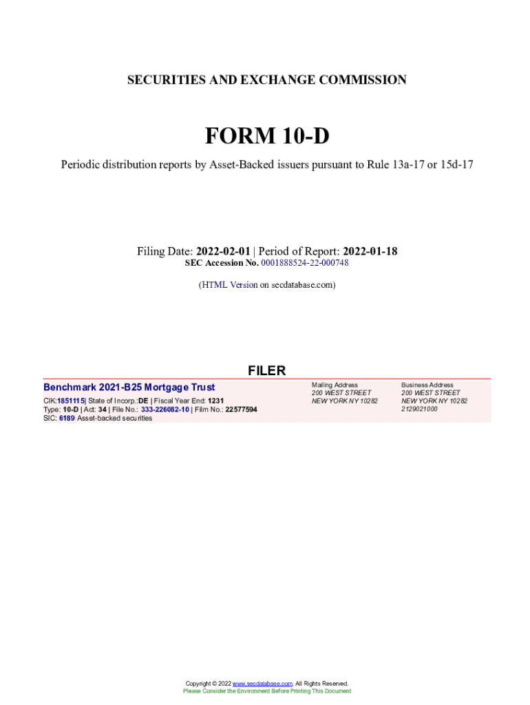 Get the free Benchmark 2021-B25 Mortgage Trust Form 10-D Filed 2022-02-01. Accession Number