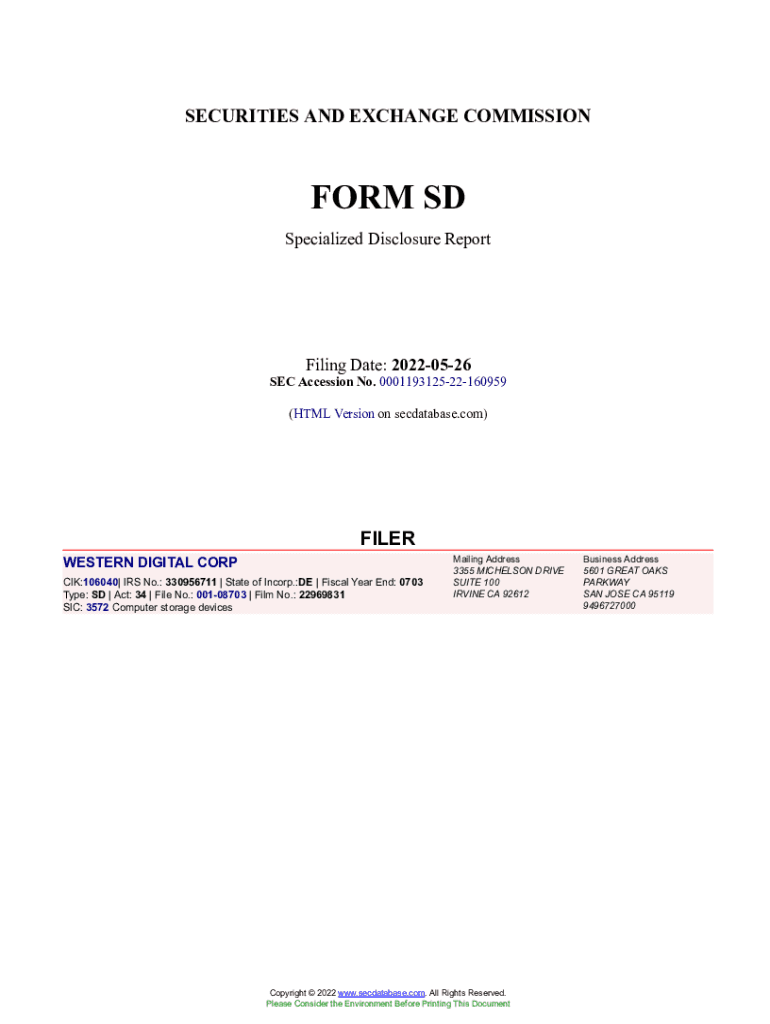 Get the free WESTERN DIGITAL CORP Form SD Filed 2022-05-26. Accession Number