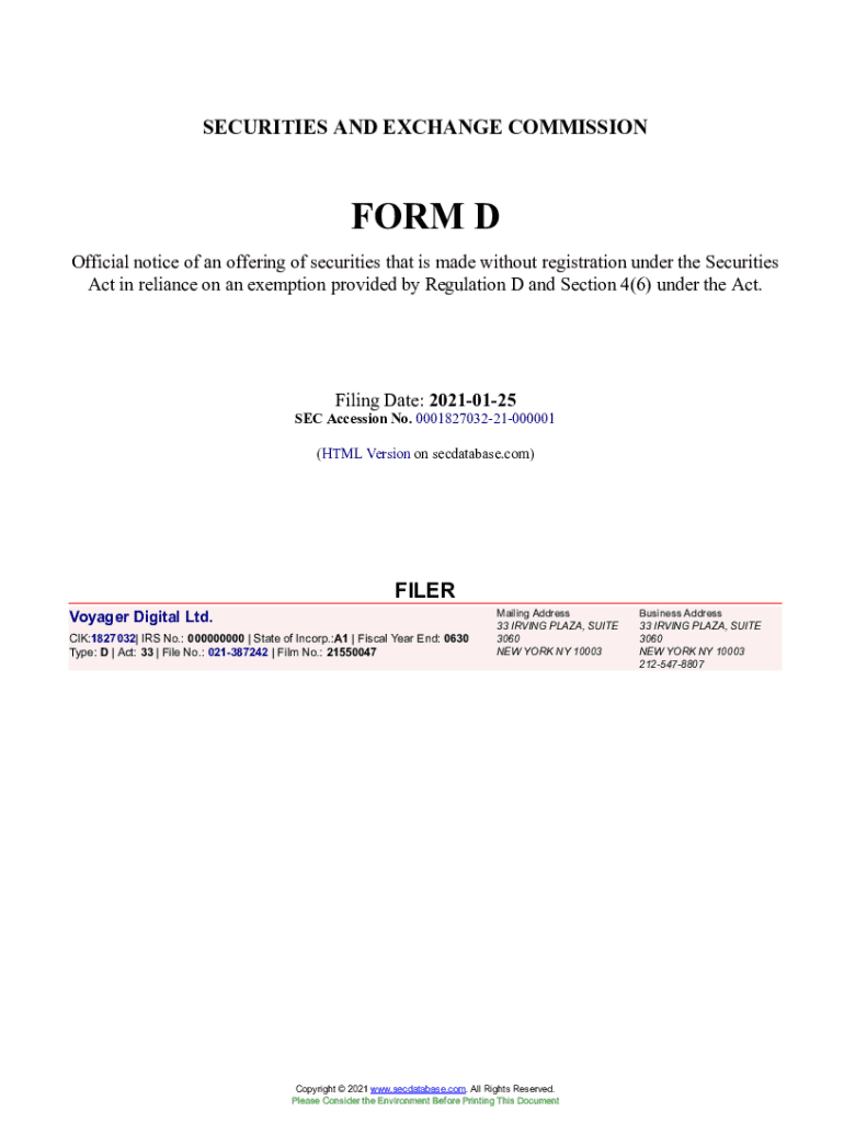Get the free Voyager Digital Ltd. Form D Filed 2021-01-25. Accession Number