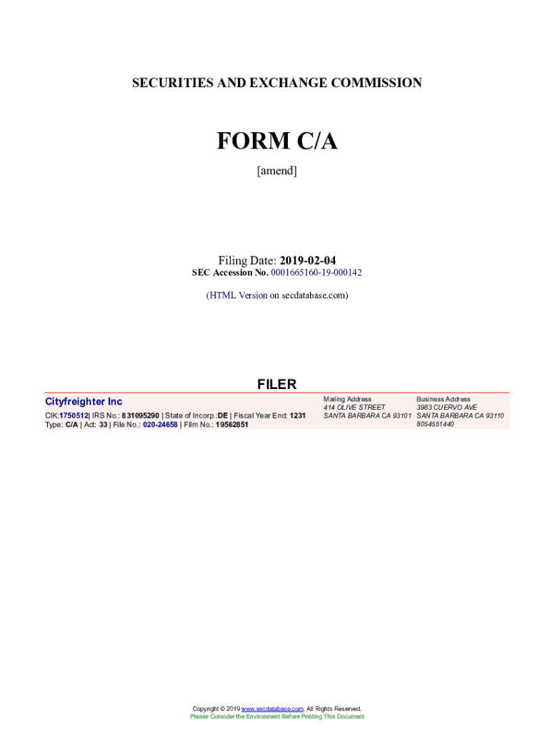 SECURITIES AND EXCHANGE COMMISSIONER C/A [amend]Filing Date: 20190204SEC Accession No. 000166516019000142 (HTML Version on secdatabase.com)FILER City freighter Inc CIK:1750512| IRS No.: 831095290