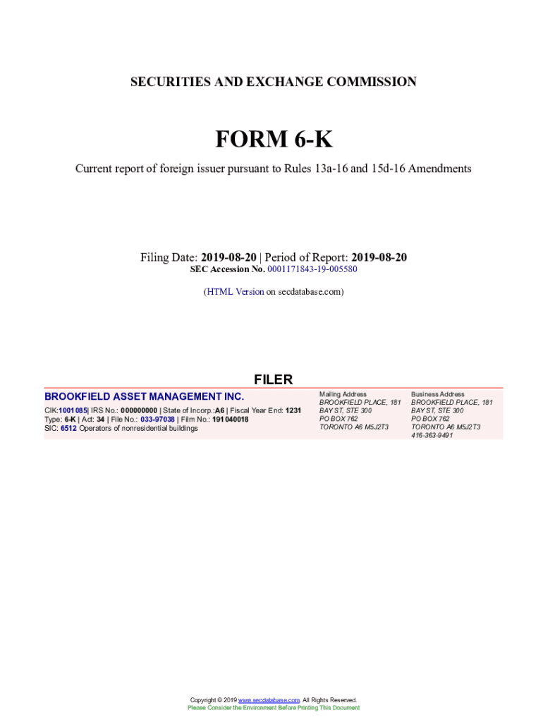 Get the free BROOKFIELD ASSET MANAGEMENT INC. Form 6-K Current Event Report Filed 2019-08-20. Acc...