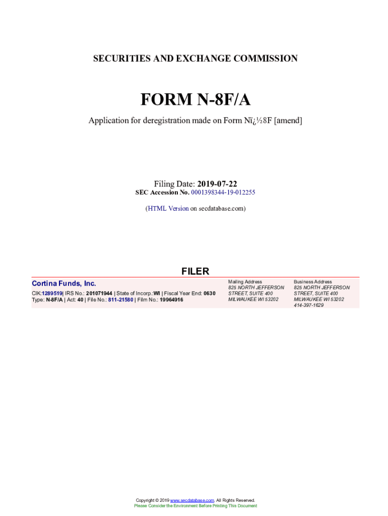 SECURITIES AND EXCHANGE COMMISSIONER N8F/A Application for deregistration made on Form N8F [amend]Filing Date: 20190722SEC Accession No. 000139834419012255 (HTML Version on secdatabase.com)FILER Corina