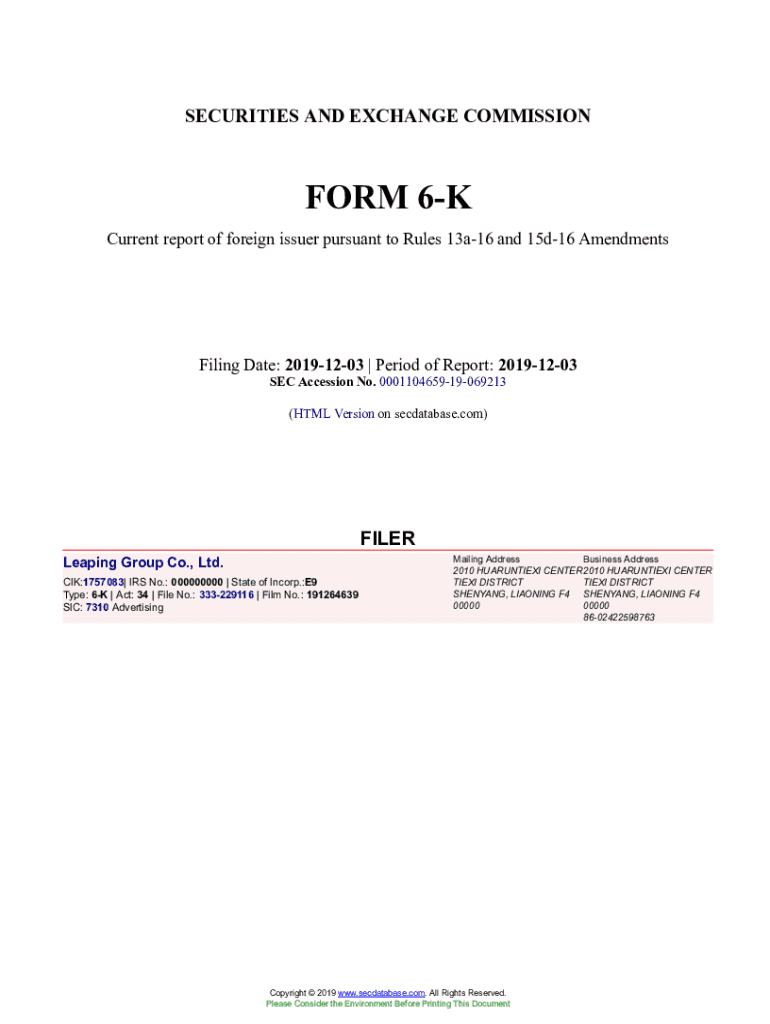 Get the free Leaping Group Co., Ltd. Form 6-K Current Event Report Filed 2019-12-03. Accession Nu...