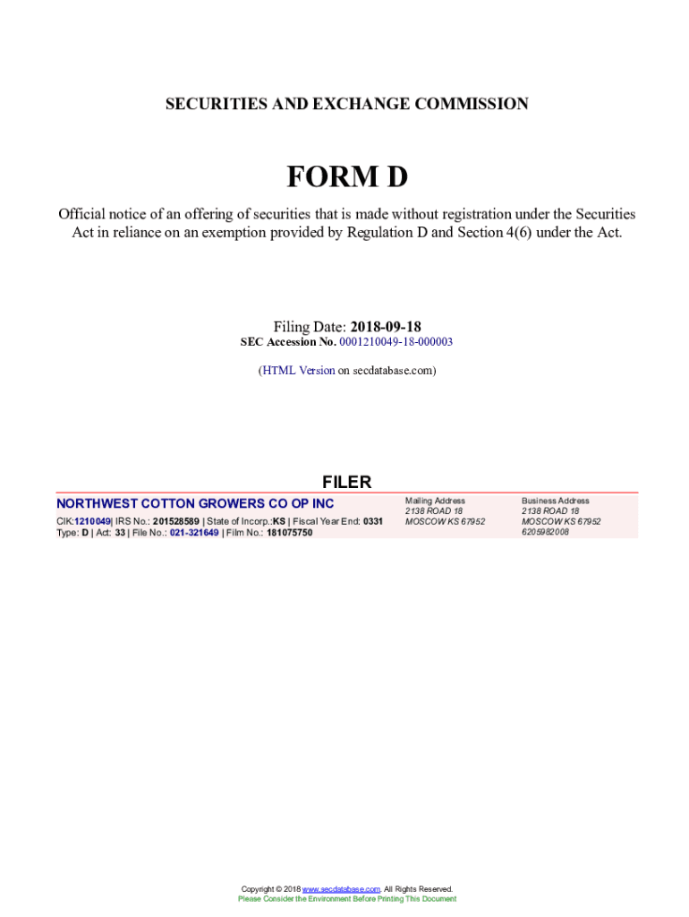 Get the free NORTHWEST COTTON GROWERS CO OP INC Form D Filed 2018-09-18. Accession Number