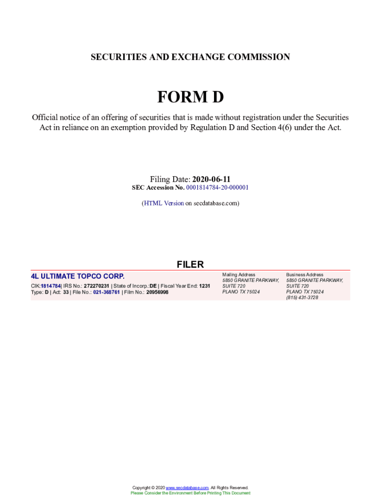 Get the free 4L ULTIMATE TOPCO CORP. Form D Filed 2020-06-11. Accession Number