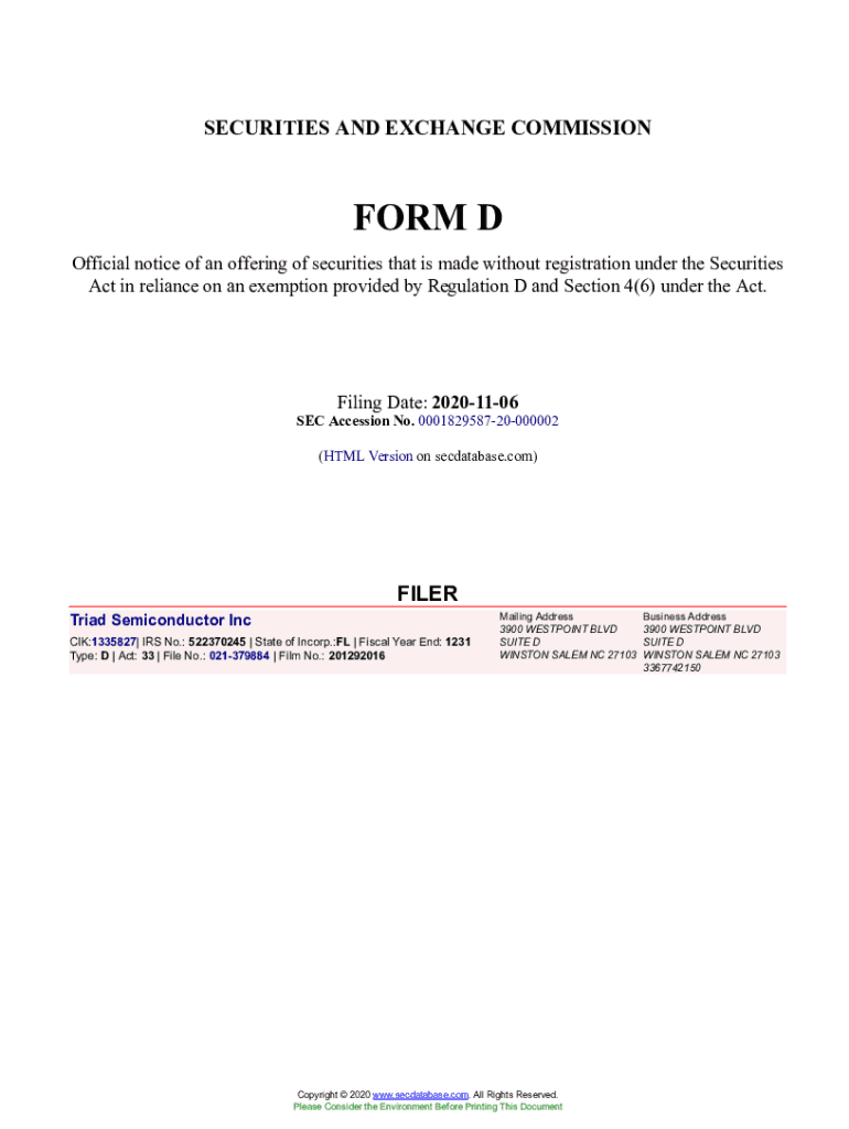 Get the free Triad Semiconductor Inc Form D Filed 2020-11-06. Accession Number