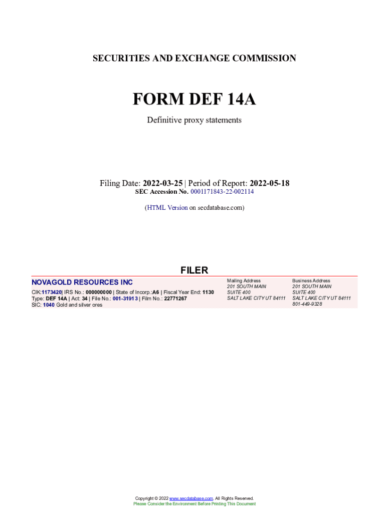 Get the free NOVAGOLD RESOURCES INC Form DEF 14A Filed 2022-03-25. Accession Number