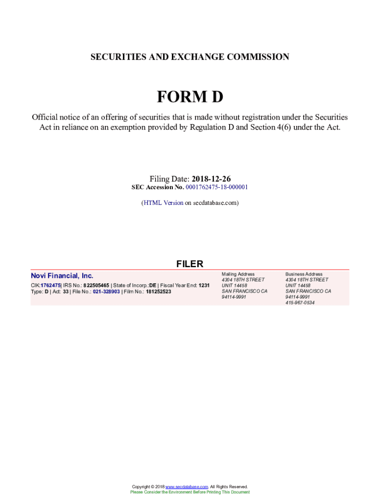 Get the free Novi Financial, Inc. Form D Filed 2018-12-26. Accession Number