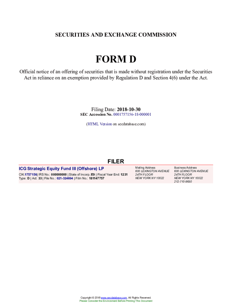 Get the free ICG Strategic Equity Fund III (Offshore) LP Form D Filed 2018-10-30. Accession Number