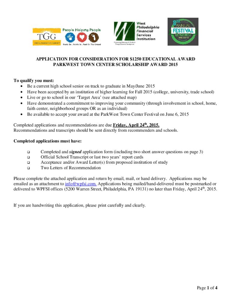 APPLICATION FOR CONSIDERATION FOR $1250 EDUCATIONAL AWARD The DARKEST TOWN CENTER SCHOLARSHIP AWARD 2015To qualify you must: Be a current high school senior on track to graduate in May/June 2015 Have