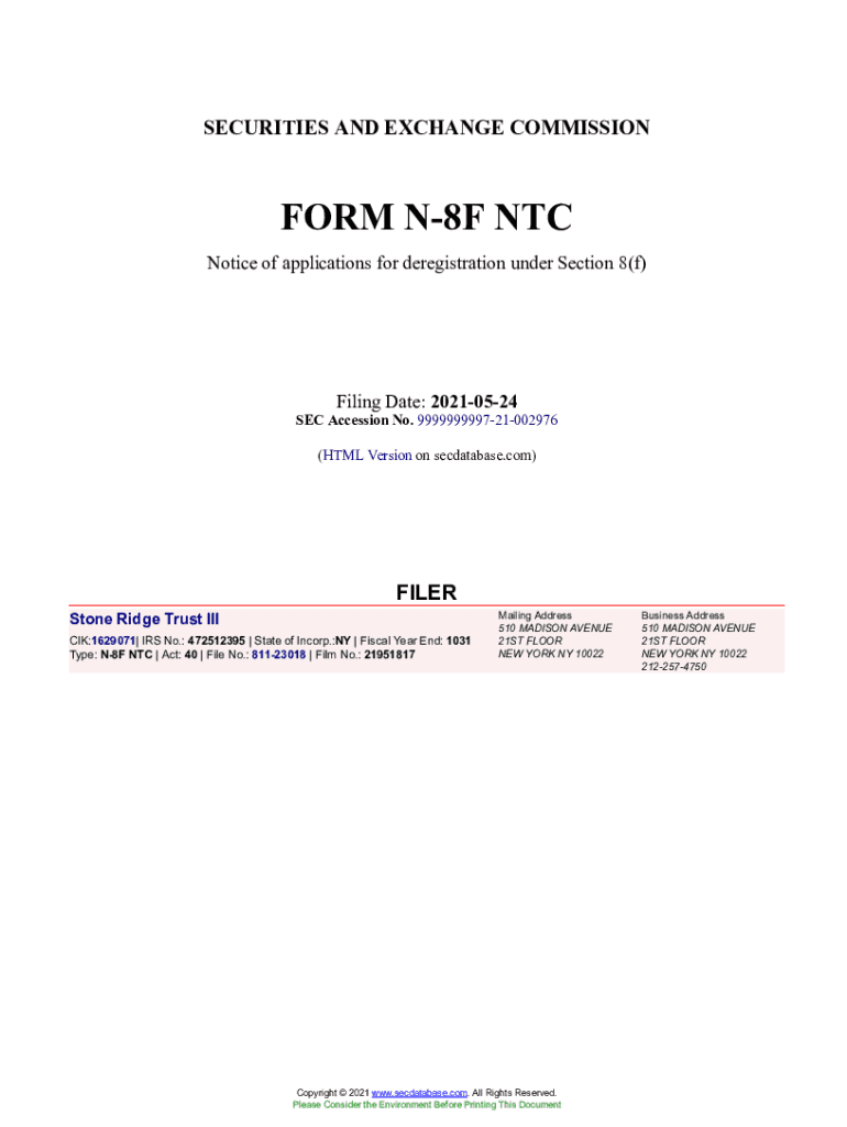 SECURITIES AND EXCHANGE COMMISSIONER N8F NTC Notice of applications for deregistration under Section 8(f)Filing Date: 20210524SEC Accession No. 999999999721002976 (HTML Version on secdatabase.com)FILER