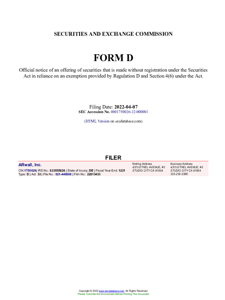Get the free ARwall, Inc. Form D Filed 2022-04-07. Accession Number