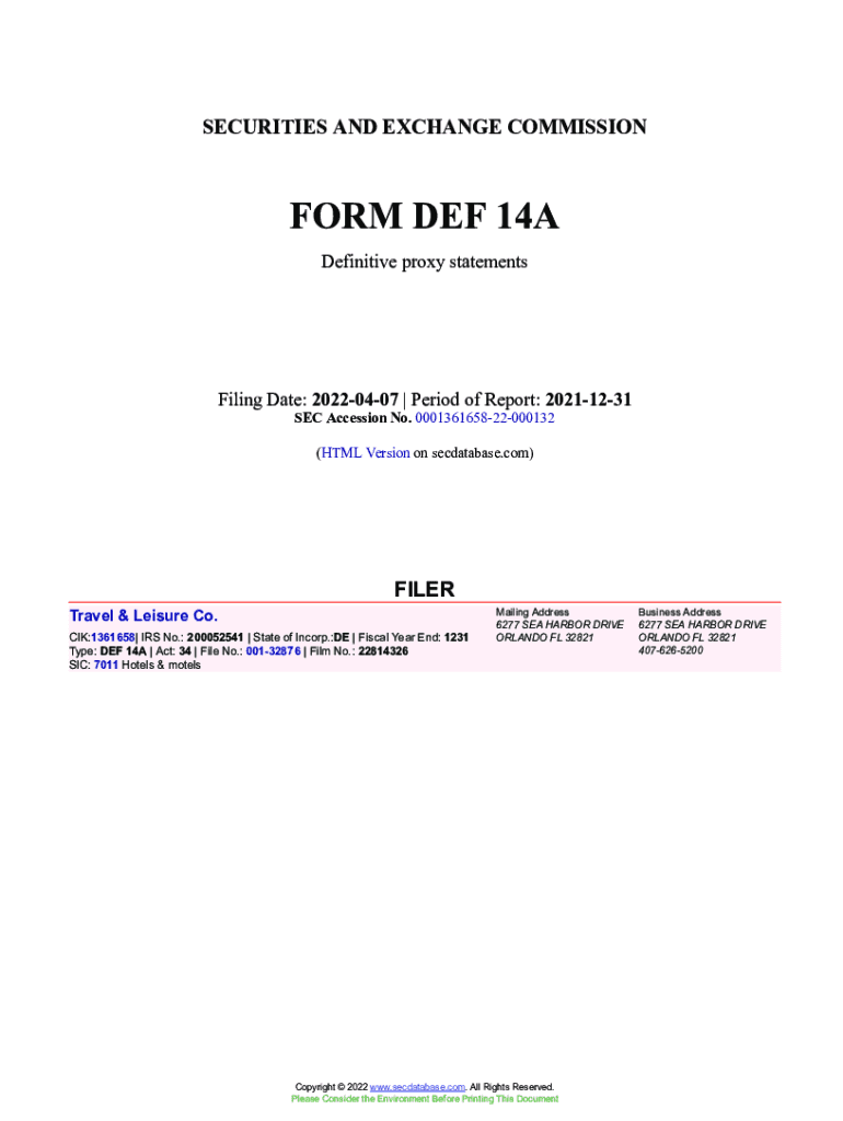 Get the free Travel & Leisure Co. Form DEF 14A Filed 2022-04-07. Accession Number