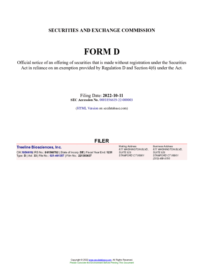 Get the free Treeline Biosciences, Inc. Form D Filed 2022-10-11. Accession Number