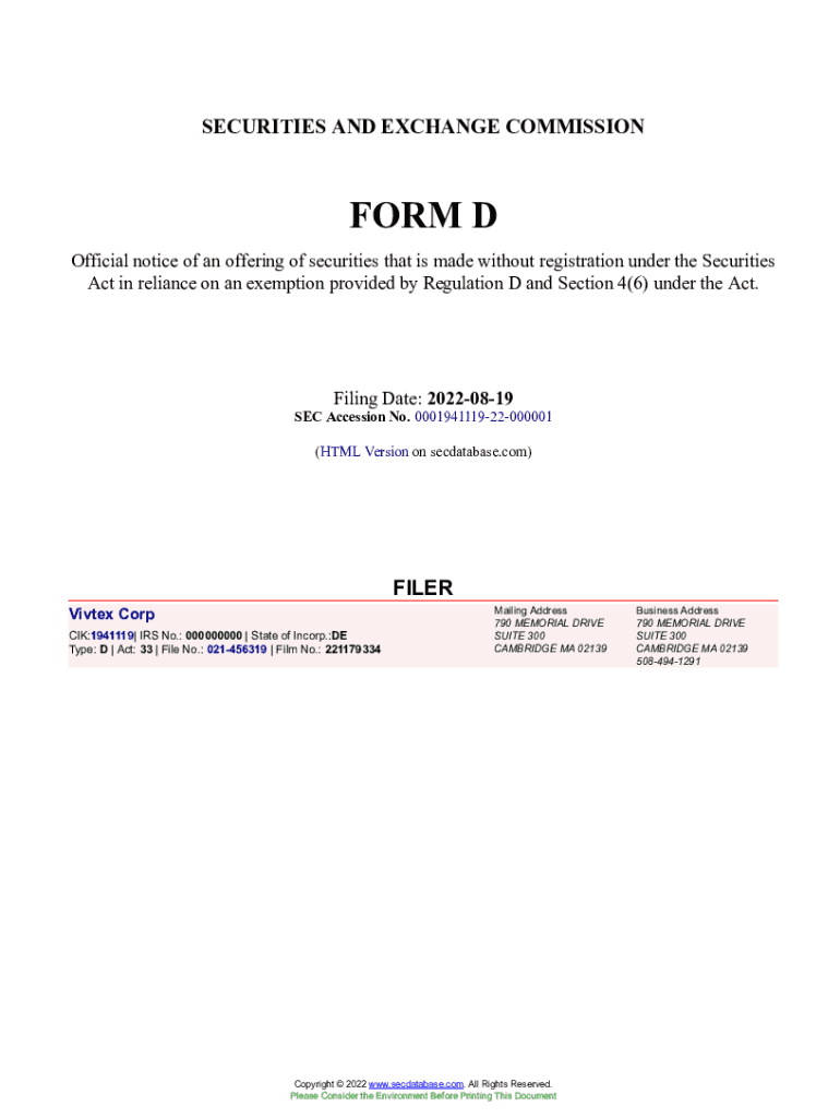 Get the free Vivtex Corp Form D Filed 2022-08-19. Accession Number