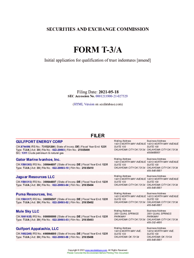 Get the free GULFPORT ENERGY CORP Form T-3/A Filed 2021-05-18. Accession Number