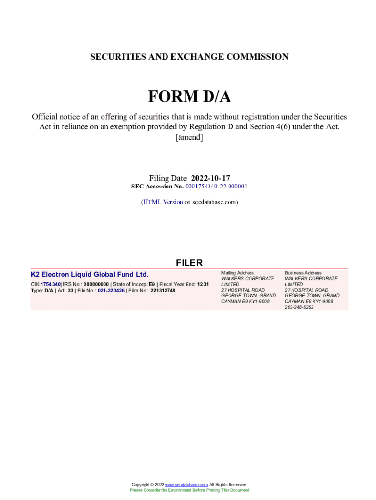 Get the free K2 Electron Liquid Global Fund Ltd. Form D/A Filed 2022-10-17