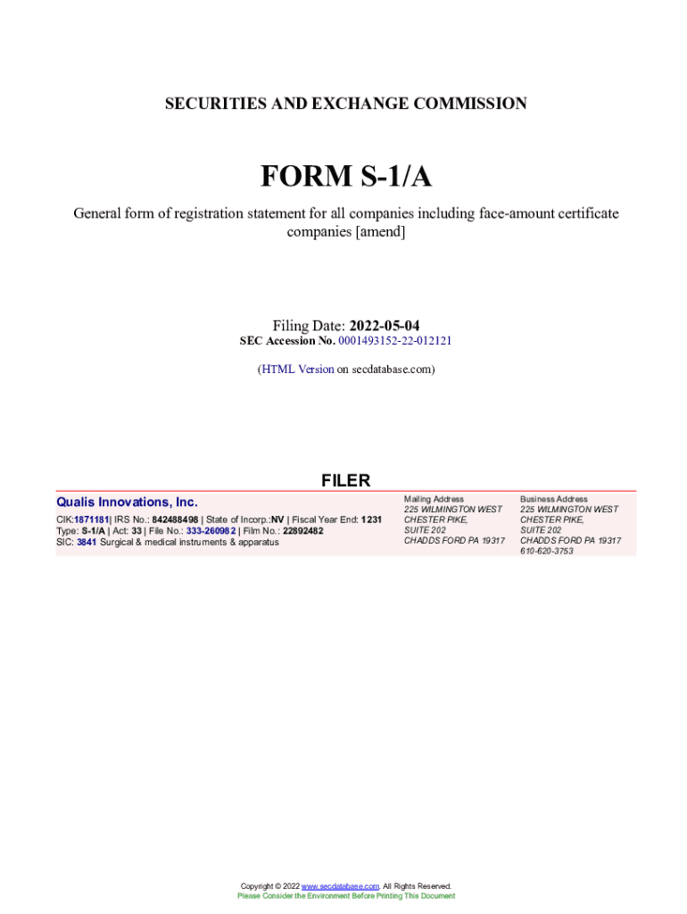 Get the free Qualis Innovations, Inc. Form S-1/A Filed 2022-05-04. Accession Number