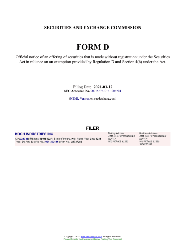 Get the free KOCH INDUSTRIES INC Form D Filed 2021-03-12. Accession Number