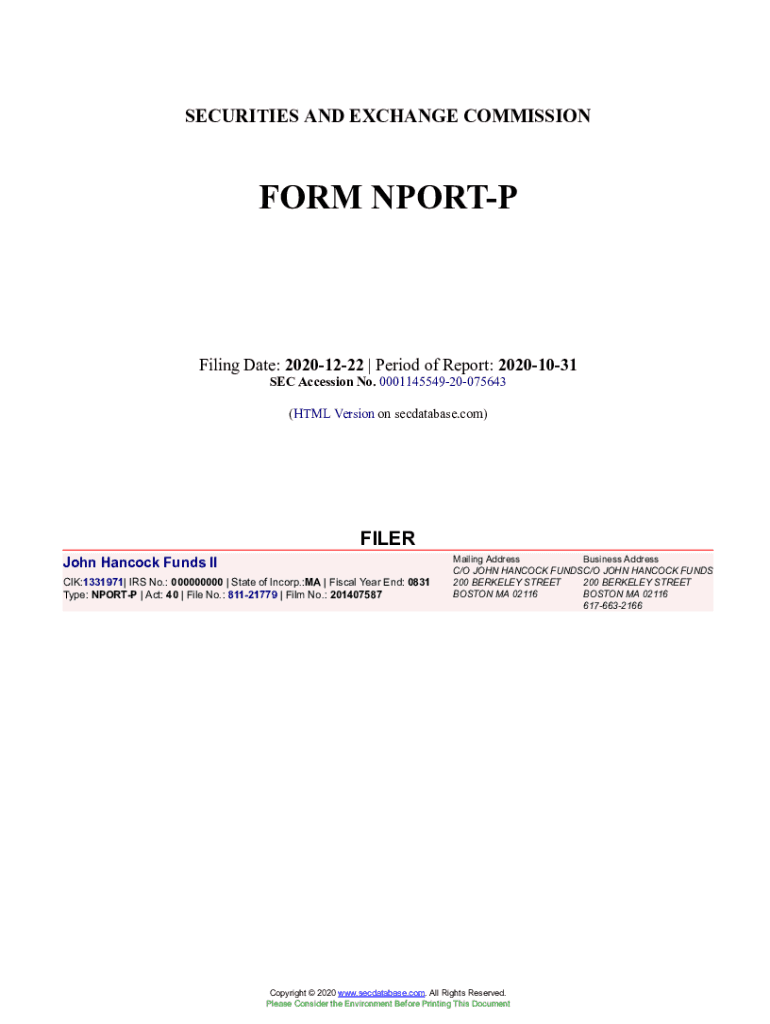 SECURITIES AND EXCHANGE COMMISSIONER NPORTPFiling Date: 20201222 | Period of Report: 20201031 SEC Accession No. 000114554920075643 (HTML Version on secdatabase.com)FILER John Hancock Funds II CIK:1331971|