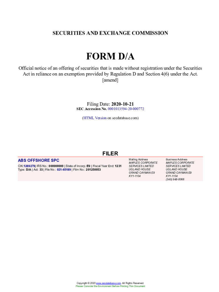 Get the free ABS OFFSHORE SPC Form D/A Filed 2020-10-21. Accession Number