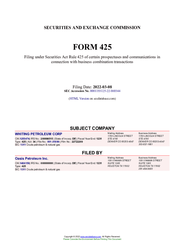 Get the free WHITING PETROLEUM CORP Form 425 Filed 2022-03-08. Accession Number