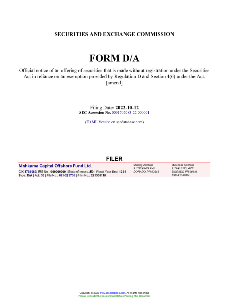 Get the free Nishkama Capital Offshore Fund Ltd. Form D/A Filed 2022-10-12. Accession Number