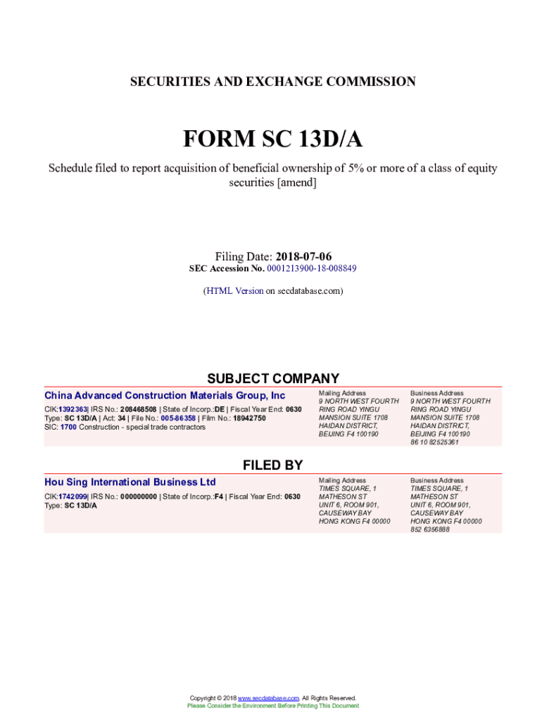 Get the free China Advanced Construction Materials Group, Inc Form SC 13D/A Filed 2018-07-06. Acc...