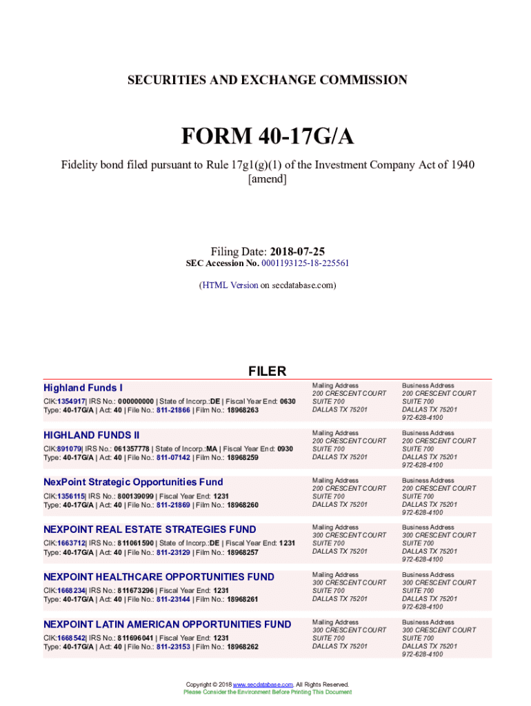 Get the free Highland Funds I Form 40-17G/A Filed 2018-07-25. Accession Number