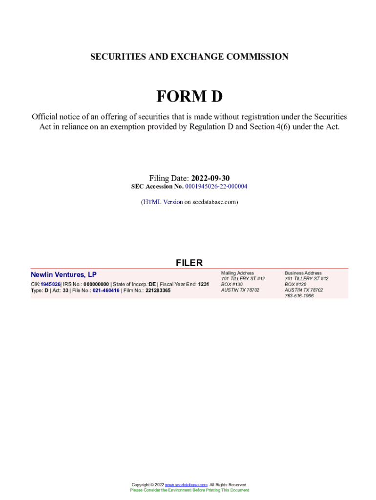 Get the free Newlin Ventures, LP Form D Filed 2022-09-30. Accession Number