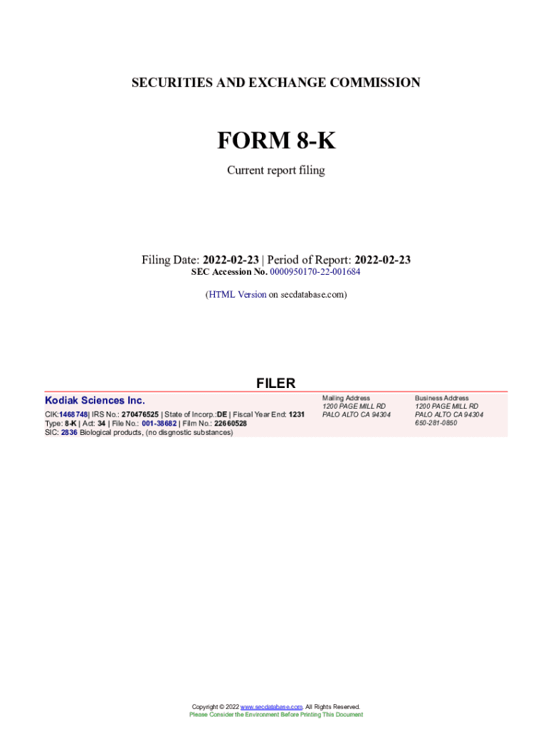Get the free Kodiak Sciences Inc. Form 8-K Current Event Report Filed 2022-02-23. Accession Number