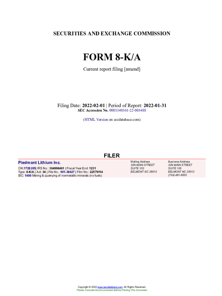 Get the free Piedmont Lithium Inc. Form 8-K/A Current Event Report Filed 2022-02-01. Accession Nu...