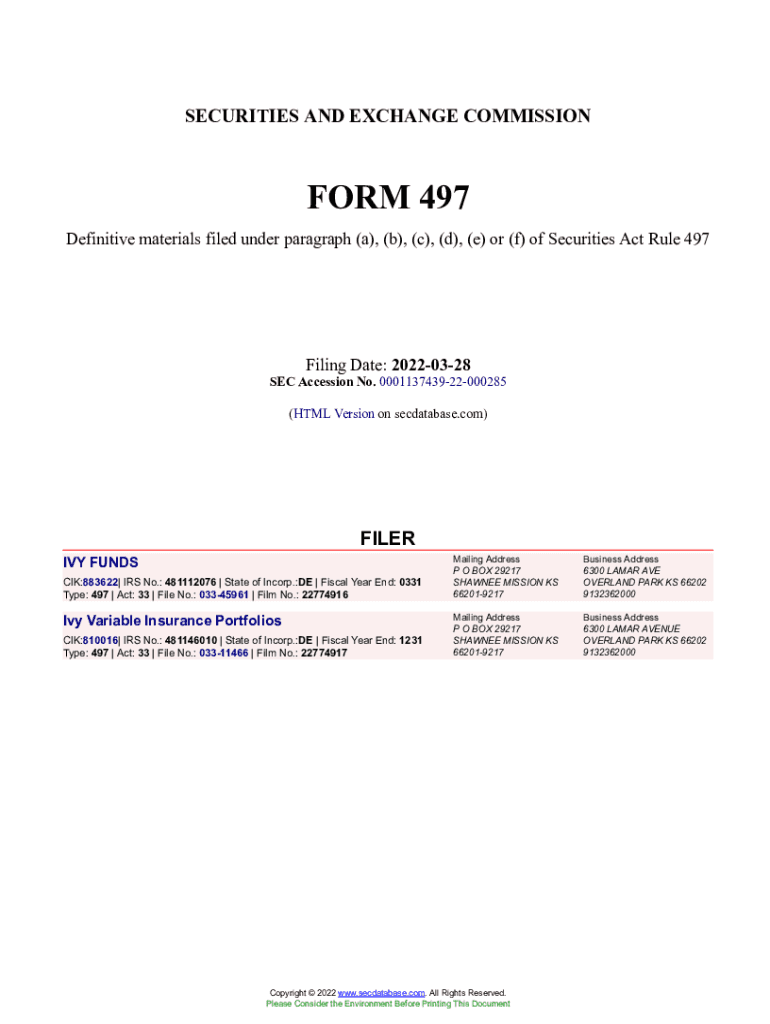 Investment companies, such as mutual funds, are required to file ivy funds form 497 with the SEC.