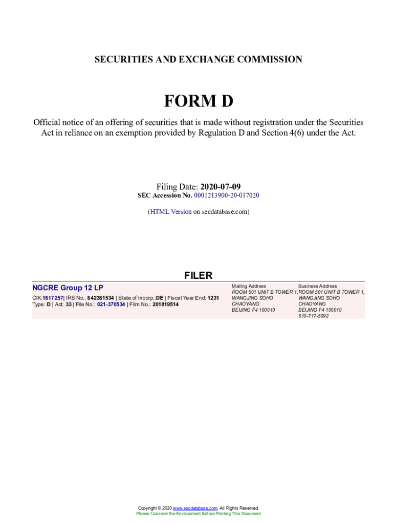 Get the free NGCRE Group 12 LP Form D Filed 2020-07-09. Accession Number