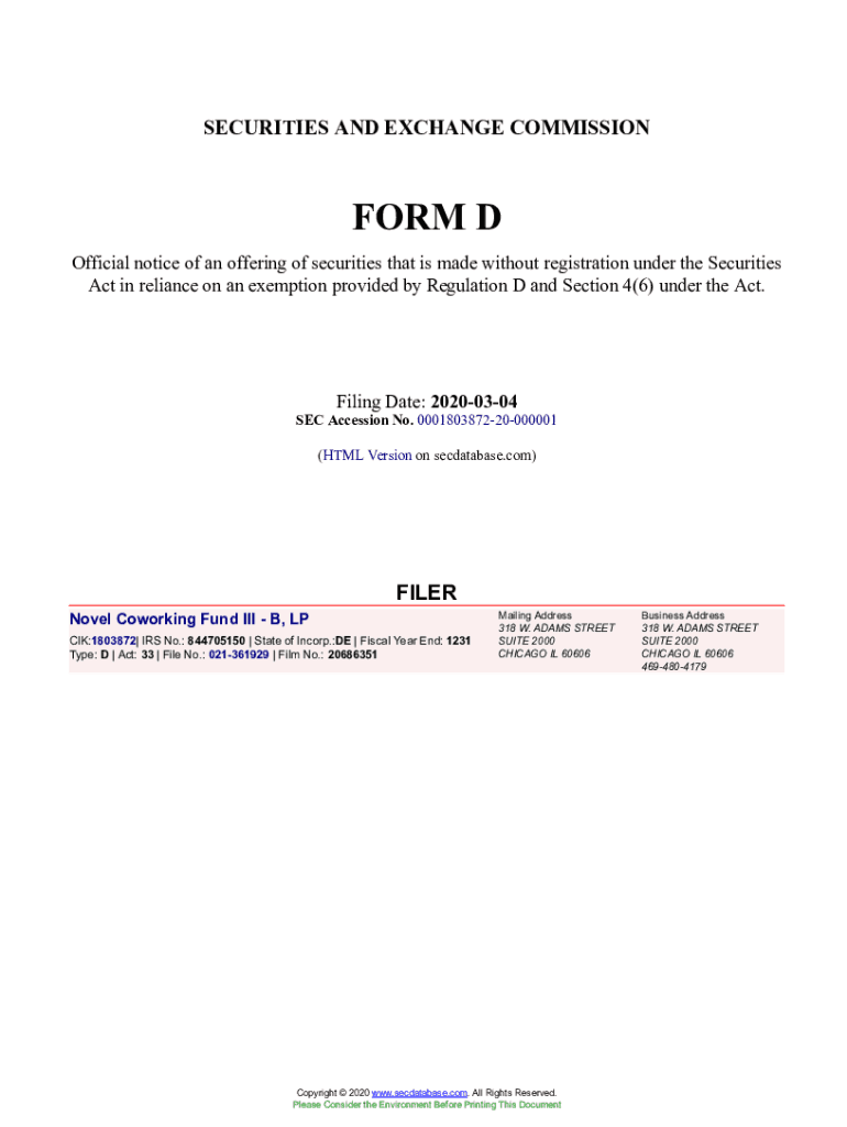 Get the free Novel Coworking Fund III - B, LP Form D Filed 2020-03-04