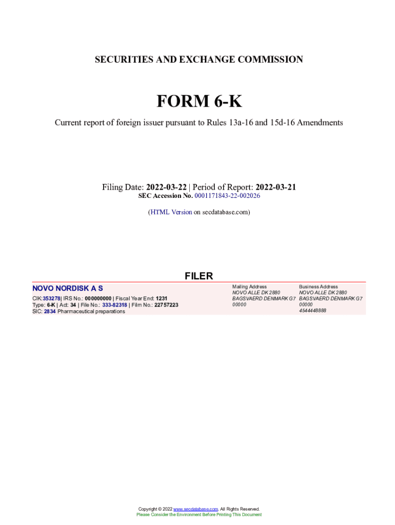Get the free NOVO NORDISK A S Form 6-K Current Event Report Filed 2022-03-22. Accession Number