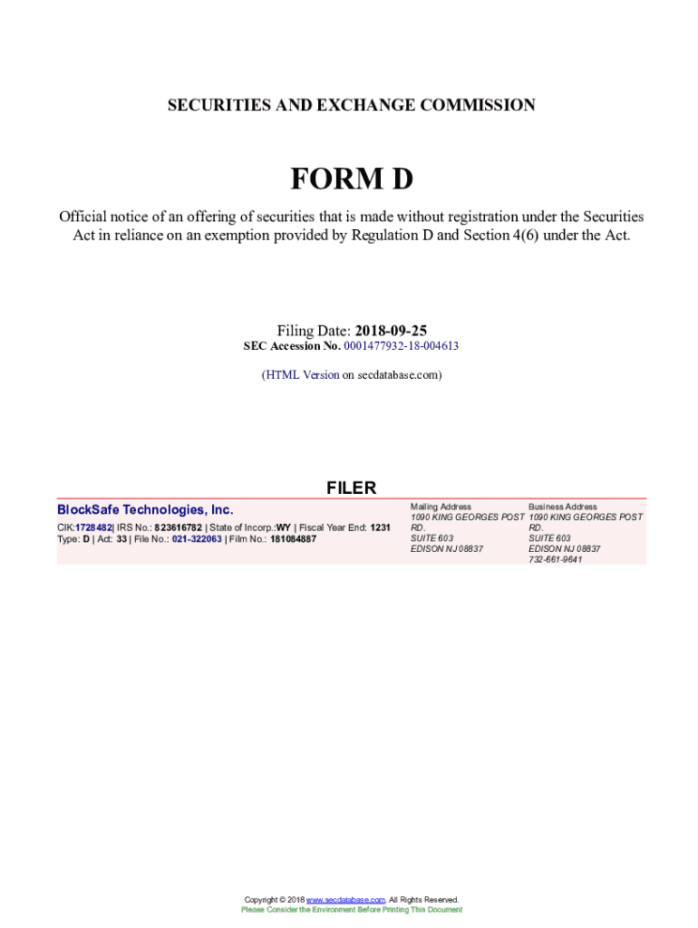 Get the free BlockSafe Technologies, Inc. Form D Filed 2018-09-25. Accession Number