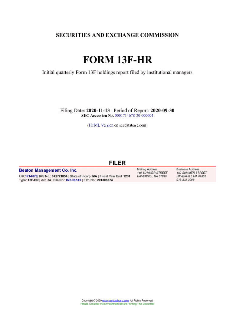 Get the free Beaton Management Co. Inc. Form 13F-HR Filed 2020-11-13. Accession Number
