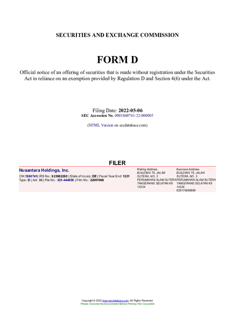 Get the free Nusantara Holdings, Inc. Form D Filed 2022-05-06. Accession Number