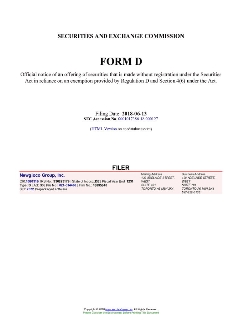 Get the free Newgioco Group, Inc. Form D Filed 2018-06-13. Accession Number