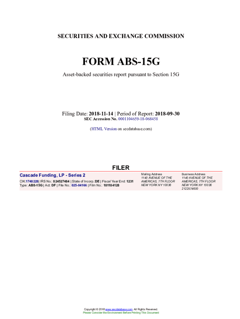 Get the free Cascade Funding, LP - Series 2 Form ABS-15G Filed 2018-11-14. Accession Number
