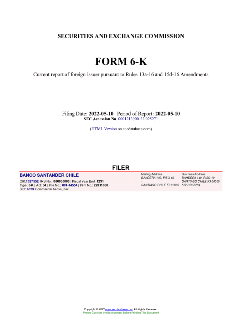 Get the free BANCO SANTANDER CHILE Form 6-K Current Event Report ...